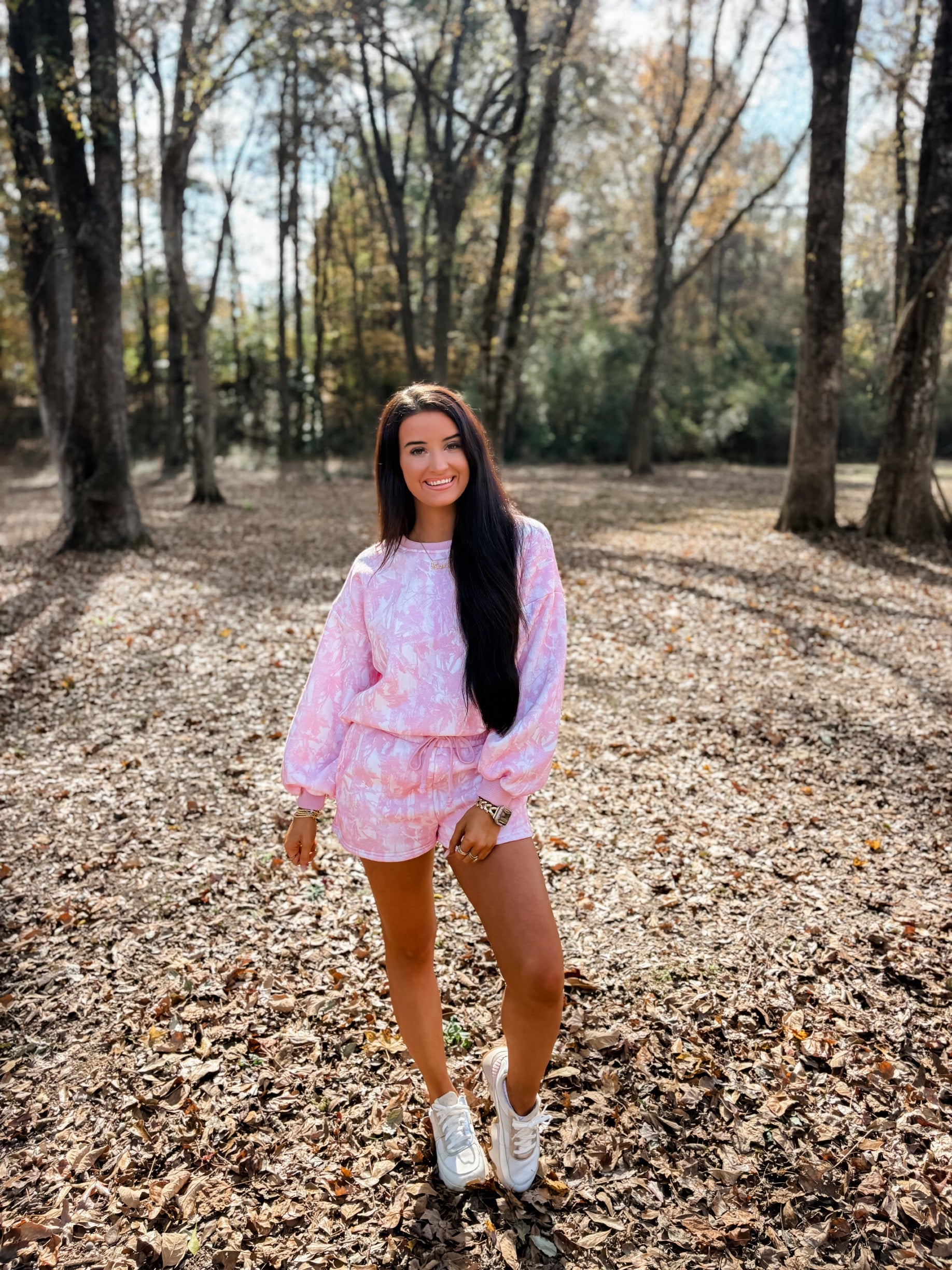 Two-piece matching set with camo pink sweatshirt and shorts-Soft washed fabric with tonal tie-dye finish -Oversized crewneck -Sweatshirt with ribbed trim -High-waisted drawstring shorts with side pockets -Great for Casual days, travel outfit, or just weekend relaxation!