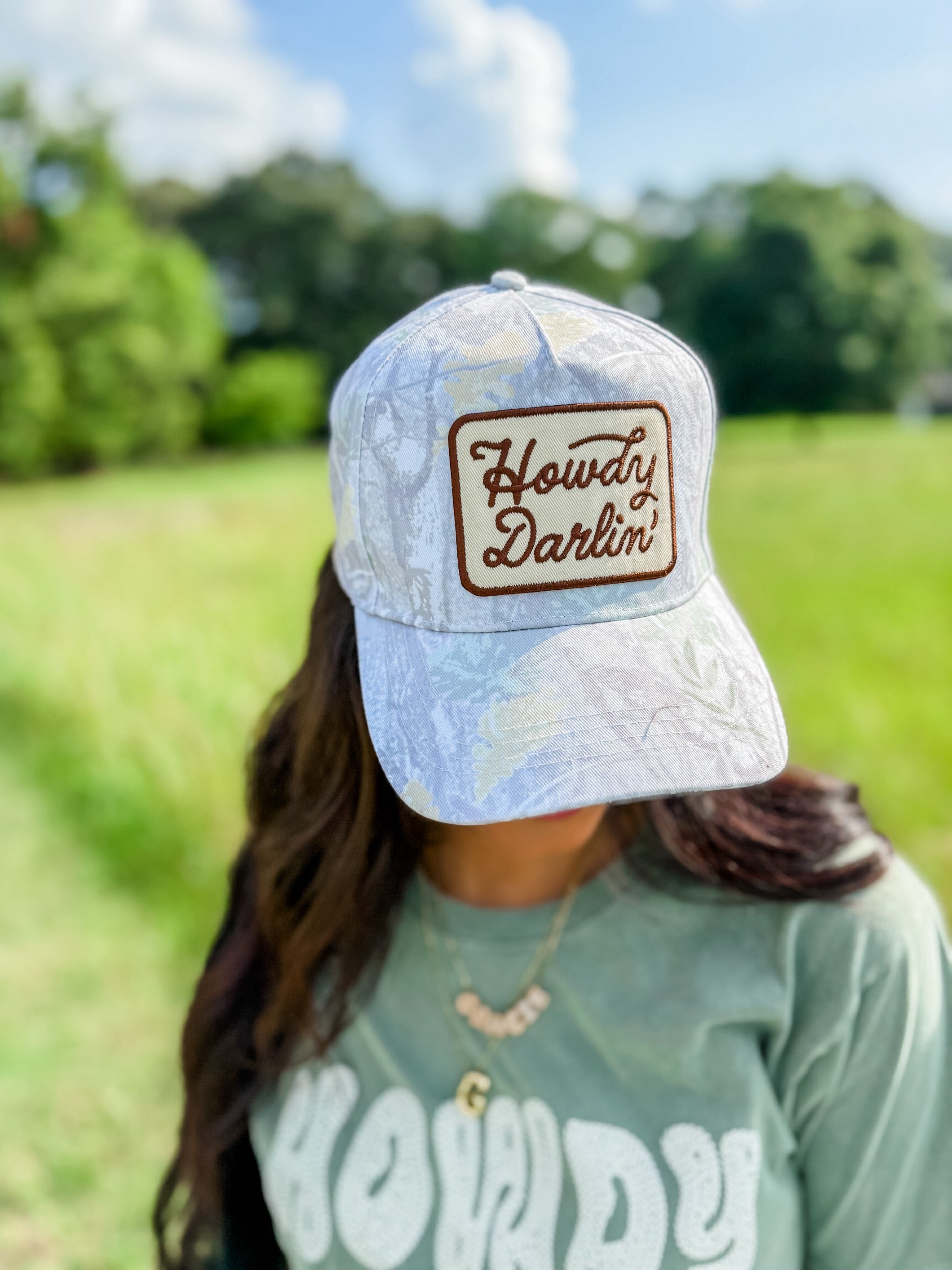 Howdy Darlin' Embroidery Patch Camo Trucker Hat - grey and white -so cute!