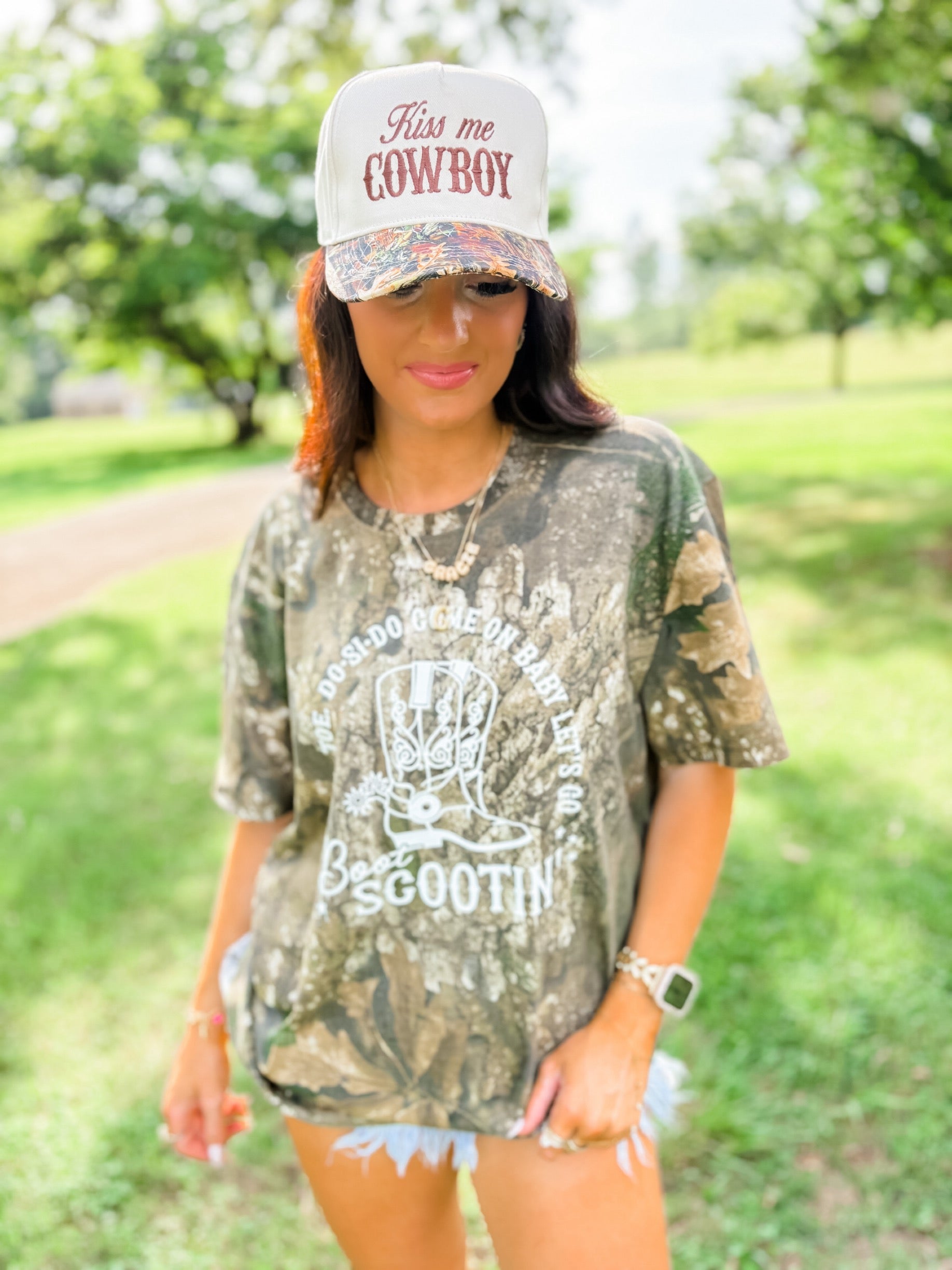 Kiss Me Cowboy Embroidery Two-Tone Cap With Brown Letters- Camouflage Print Design -